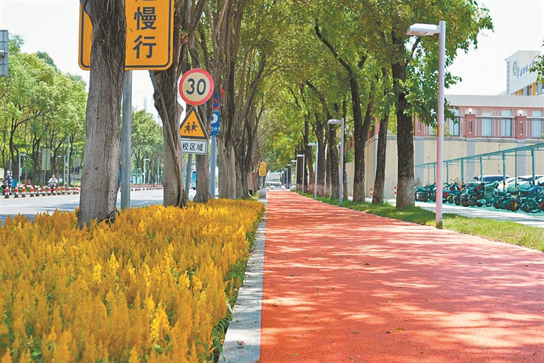 此次改造,大学城通过设置慢行系统,分为慢跑骑行道与林荫步道。全岛新增铺设约58公里的彩色慢跑骑行道,主要分为四种颜色:内环路为活力橙,中环路为文化蓝,外环路为科技红,其他区域道路是中性灰。四色的设计,既彰显跃动的青春气息,也方便方向感欠佳的人辨别位置。