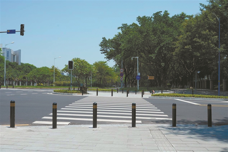 改造后,林荫步道的铺装全面更新,补全盲道,行走起来平整连贯。路口处改用全宽式放坡,宽敞的设计让骑行者和轮椅使用者得以各行其道,无障碍水平显著提升。同时,路口增设止车柱,设置小转弯半径让汽车减速通过,较宽的道路中间还增加安全岛。此外,配套设置指示系统、灯光照明与夜跑支持设施,构建安全友好的大学城慢行空间。