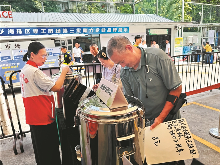 “最近天气很热,招工广场有免费凉茶派送。你看这杯清肝明目茶,专门为我们熬夜赶工的人配制的,喝着舒服,眼睛都没那么酸胀了。”做了30年制衣工的黄师傅告诉记者。康鹭新招工广场是广州市海珠区凤阳街的核心地带,每天有上万名纺织工人、外卖小哥和快递员在这一带奔波。高温下,他们的衣衫被汗水浸透,但手中多了一杯免费的凉茶——“流动绿洲”项目提供的“广式”清凉。一杯凉茶里,藏着康鹭这些年的变化。