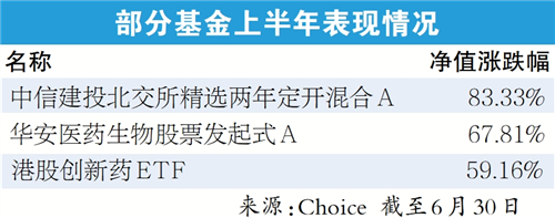 今年上半年,A股市场整体表现较为平稳,医药、北交所、科技等领域表现亮眼,带动相关主题基金净值上涨。Choice数据显示,截至6月30日,全市场(A/C份额分开计,下同)1万多只股票型基金和混合型基金中,今年以来超七成获得正收益,中信建投北交所精选两年定开混合、华夏北交所创新中小企业精选两年定开混合发起式、华安医药生物股票发起式、嘉实互融精选股票、平安医药精选股票等多只北交所和医药主题基金涨幅超50%。