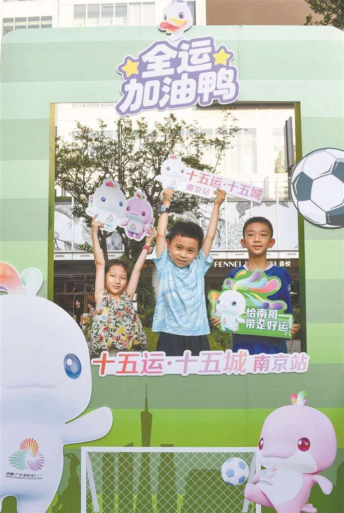除了线上助威,线下活动也丰富多彩。7月5日,在南京队与苏州队比赛之前,“十五运·十五城”南京站活动在南京建邺华采天地拉开序幕,不仅“搬”来了趣味足球场,十五运会和残特奥会的吉祥物“喜洋洋”“乐融融”也在现场亮相。现场还设置精美合影墙,吸引一大波市民游客前往打卡互动。