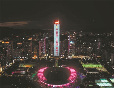 “十五运·十五城”南京站活动前,广州地标中信大厦亮灯为南京加油助威