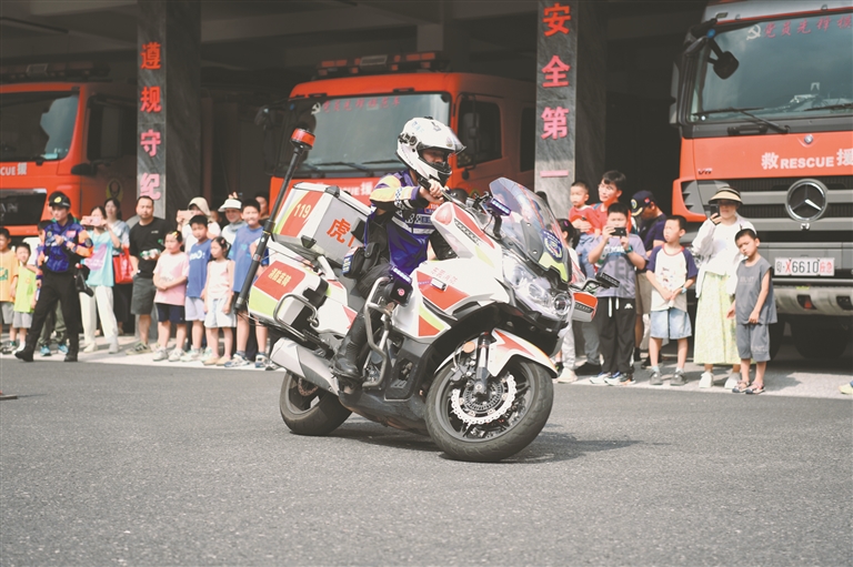 “真厉害!”看着橱窗里的一张张奖牌奖状,孩子们不由得放轻了脚步。汤乐琪小朋友觉得活动很有意义。过去,她也曾在校园里参加过消防体验日活动,但不像这次如此深入了解过消防员的日常。她说:“原来橱窗里那些闪亮的奖牌背后,是每天要扛起那么重的装备,是流那么多的汗水,消防员哥哥姐姐们真是了不起!”记者了解到,近年来,虎门消防救援大队被东莞市政府记集体三等功,大队部党支部被中共广东省直属机关工作委员会评为“四强”党支部,虎门消防救援站被共青团中央认定为“一星级全国青年文明号”,虎门消防蓝骑突击队获评“广东119消防奖”先进集体和广东省国家机关“谁执法谁普法”创新创先项目,荣获第十一届广东省直机关“先锋杯”工作创新大赛二等奖。