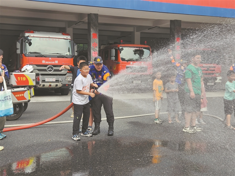 前来参加活动的叶礼荣小朋友扳下开关,一股高压水柱喷射而出,后坐力之大让他握“枪”的双手不由颤抖。消防员哥哥忙替他把住方向,他扭动喷嘴,直射的水柱倏然变成了开花漫射,水幕在阳光下挂了一道彩虹。“哇!”在小伙伴们的一片惊叹声中,他勇敢地成了第一个体验消防水枪的孩子。