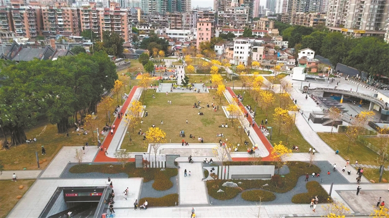 尘封多年的陈家祠东广场,今年焕新开放,成为老城区不可多得的一处“市民客厅”。由广州市住房和城乡建设局牵头,这项城市品质提升工作将昔日的地铁临时用地,转变为集民生、生态、文化功能于一体的开放式公共空间,为老荔湾注入新的绿色活力。