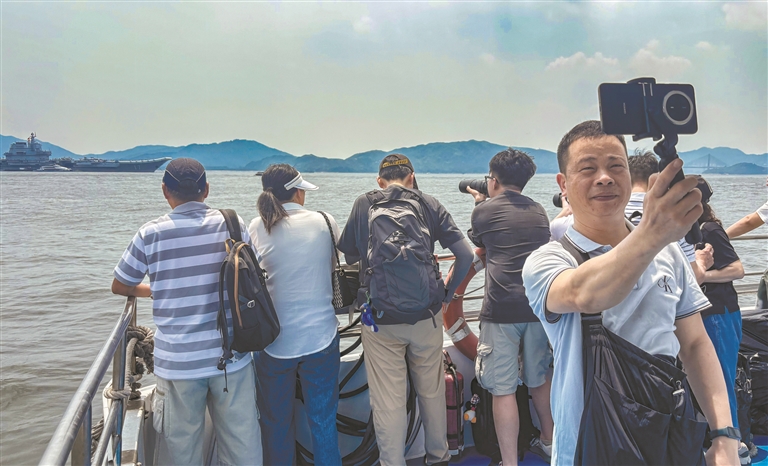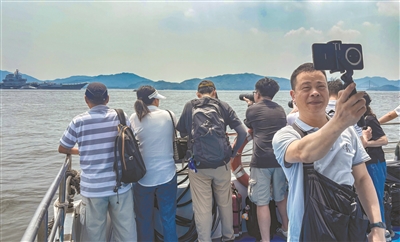 看到山东舰,船上乘客兴奋起来,纷纷拿出手机、照相机拍照留念。在香港读书的高同学经历登舰参观票“抢票”失败后,在网上看到了乘游船打卡航母的攻略,立即购买了船票,他还专门带了望远镜想更清楚地看到山东舰。“这是除了登舰外,视野最好、看得最清楚的位置了。”高同学开心地说。70岁的陈伯告诉记者,他看到航母感到非常自豪:“亲眼看到航母,更真实感受到祖国的强大!”香港市民庞先生特意带了自拍杆来打卡国之重器:“专门过来看山东舰,这是国家的骄傲!看到国家的军事和科技发展起来非常自豪!”庞先生说,虽然没能上舰有些遗憾,但可以在海上打卡也很开心,他还带了自拍杆想拍得更全面。韩女士带着6岁半的儿子乘船打卡山东舰,她连连为山东舰点赞:“之前参观了湛江舰和运城舰,现在又乘船来看山东舰。山东舰很大,看着好厉害!”