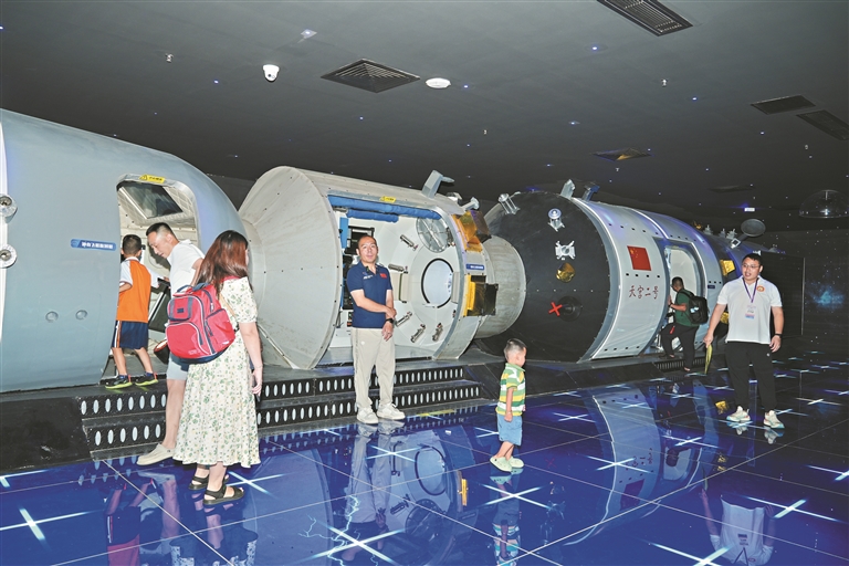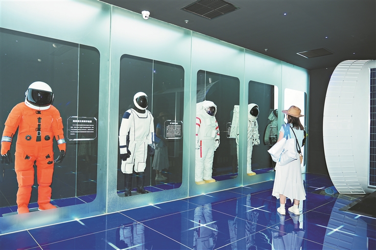 在“火星基地”,国内首创的“实景沙盘+MR混合现实”交互技术让观众仿佛置身红色星球,亲手操控探测车采集“火星土壤”。“筑梦天宫”展区通过360度镜像空间还原中国空间站内部环境,观众可在此深度体验航天员的日常工作与生活;借助VR眼镜和气闸舱模拟进行惊险的太空行走任务,参与有趣的“天地通话”接收来自地球的信息,或在失重环境下挑战“太空育种”的闯关游戏。此外,中心还配备了如多维滚环、六分之一重力展项等专业航天员训练设备,让公众亲身体验航天员的严苛训练。