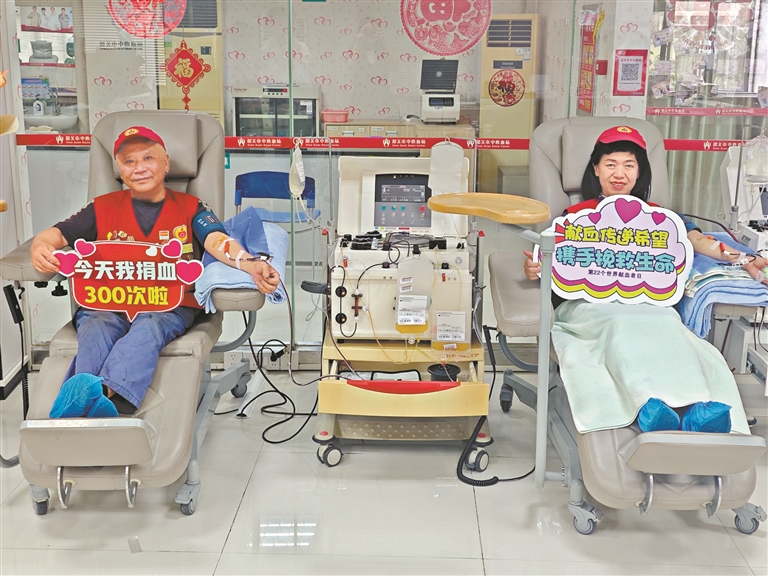 广州日报讯 (全媒体记者卜瑜 通讯员李慧文、华永锋摄影报道)近日,来自韶关钢铁公司的刘碧南在韶关市中心血站进行第300次无偿献血,其妻子张屹陪同也完成了自己在韶关市中心血站的第326次无偿献血。20多年来,刘碧南和张屹这对“热血夫妻”合计无偿献血626次,累计23万多毫升的捐血量,参与挽救了1000多人的生命,创造了中国境内夫妻双双无偿献血300次的惊人纪录。