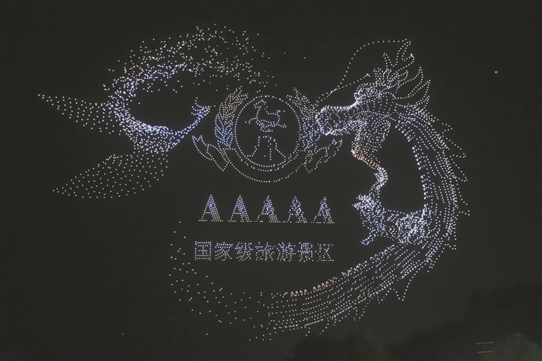 当晚8时,无人机在夜空中排列组合,形成各种精美的图案和文字,为观众带来一场无与伦比的光影秀。11198架无人机编织出“鱼跃龙门·开湖献礼”“厨王争霸·鲜鱼幻宴”“生态长卷·青山绿水30年”“碧波生花·花神巡游”“星河织锦·龙凤贺寿”“未来之窗·科技生态共生”六大主题画面。