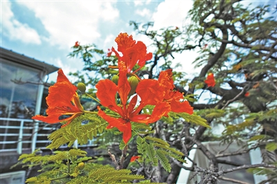 登上爱范儿未来社屋顶的小平台,地面和墙体上橙白相间的斑马纹延伸开去,将视线引向远处高耸的广州塔。一侧,广州科学馆巨大的钢铁框架已经成形;稍远处,广州艺术博物院的环保幕墙勾勒出木棉花形态的建筑线条;另一侧,凤凰树梢上,几朵橙红的花朵鲜艳欲滴,穿过枝叶间望去,工业感十足的屋顶一层层铺陈开来,别有一番韵味。