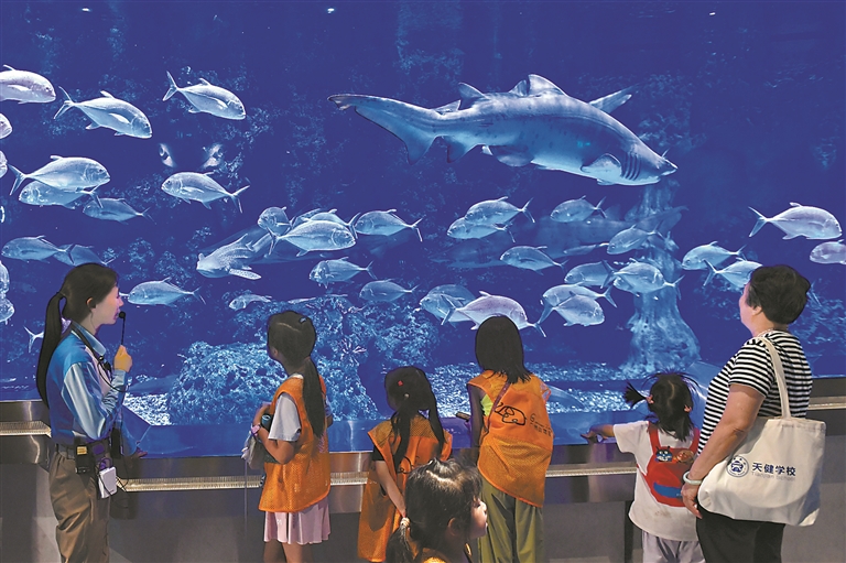 亲子家庭在科普老师的带领下认识海洋生物。