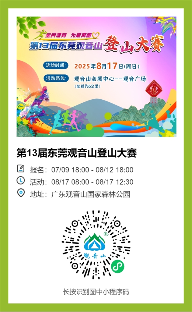 心动了?赶紧报名吧!即日起可报名(扫描二维码),至8月12日18:00截止。东莞观音山特别推出28元/张的专属特惠门票,含:活动当天观音山门票(赛事券),号码布(含电子计时芯片),计时服务、电子完赛证书、赛事保险、竞赛服务、补给水等。比赛时间为8月17日(周日)8:00—12:30。