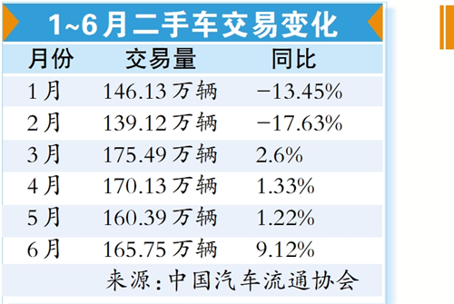 1~6月二手车累计交易量同比增长1.99%,与新车市场10%的增速相比差距明显