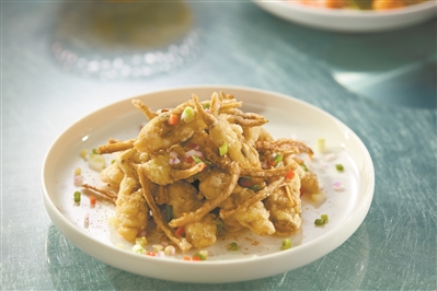 铁板盐焗蛏,是将海盐加花椒炒热,把鲜活哆头蛏插入其中通过铁板和海盐传热,将咸鲜渗入蛏肉,焖烤7分钟,哆头蛏的鲜嫩刚刚好;很多人以为,炒蛏还有什么难的?但当地蛏农却说,哆头蛏就得闭口炒才好吃。所谓“闭口炒”,即哆头蛏炒出来蛏壳是闭着的,不像一般的炒贝类,壳都是打开的。据介绍,原来是在炒海蛏之前,厨师会在每一颗蛏壳中间剪一刀,这样炒出来的海蛏不会开壳,肉质肥嫩,又能保留其鲜甜多汁的口感。调料也不需要多放,姜葱加一点福建老酒,越简单越能保留其原汁原味的鲜。