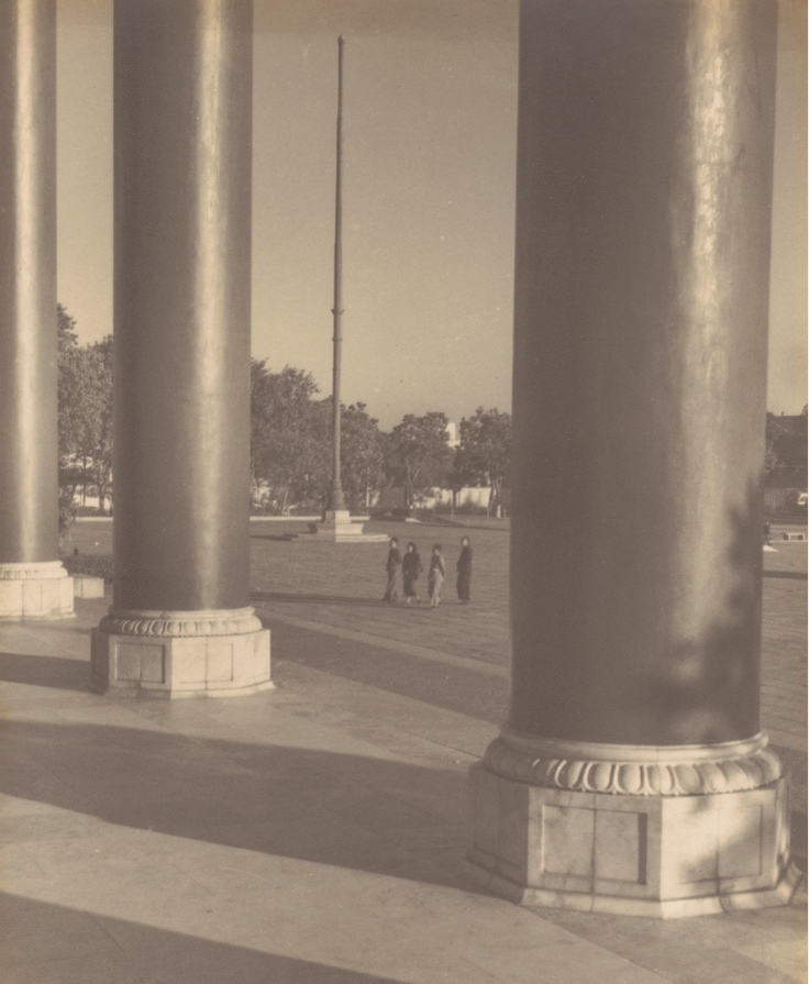而从近来各收藏、拍卖机构陆续发布的部分叶六如作品也能看出,他也大胆尝试了一些画意摄影的表现形式。如他摄于1937年的《冷月孤莺》,以宠物鹦鹉为模特,用灯光模拟一轮明月,融入“画堂鹦鹉语雕笼”的诗意,俏皮可爱,引人回味。但受西方现代主义艺术思潮影响颇深的他,相对来说更加注重镜头的框取,以及画面中的线条感和节奏感,被评价为“在平常场景中框取那些不平常的角度”,从而令作品显得力量感十足。如在一件作品中,他拍摄了一个坐在铁架台阶上的孩子,钢铁质地的坚硬感与孩子的天真懵懂形成强烈的对比。
