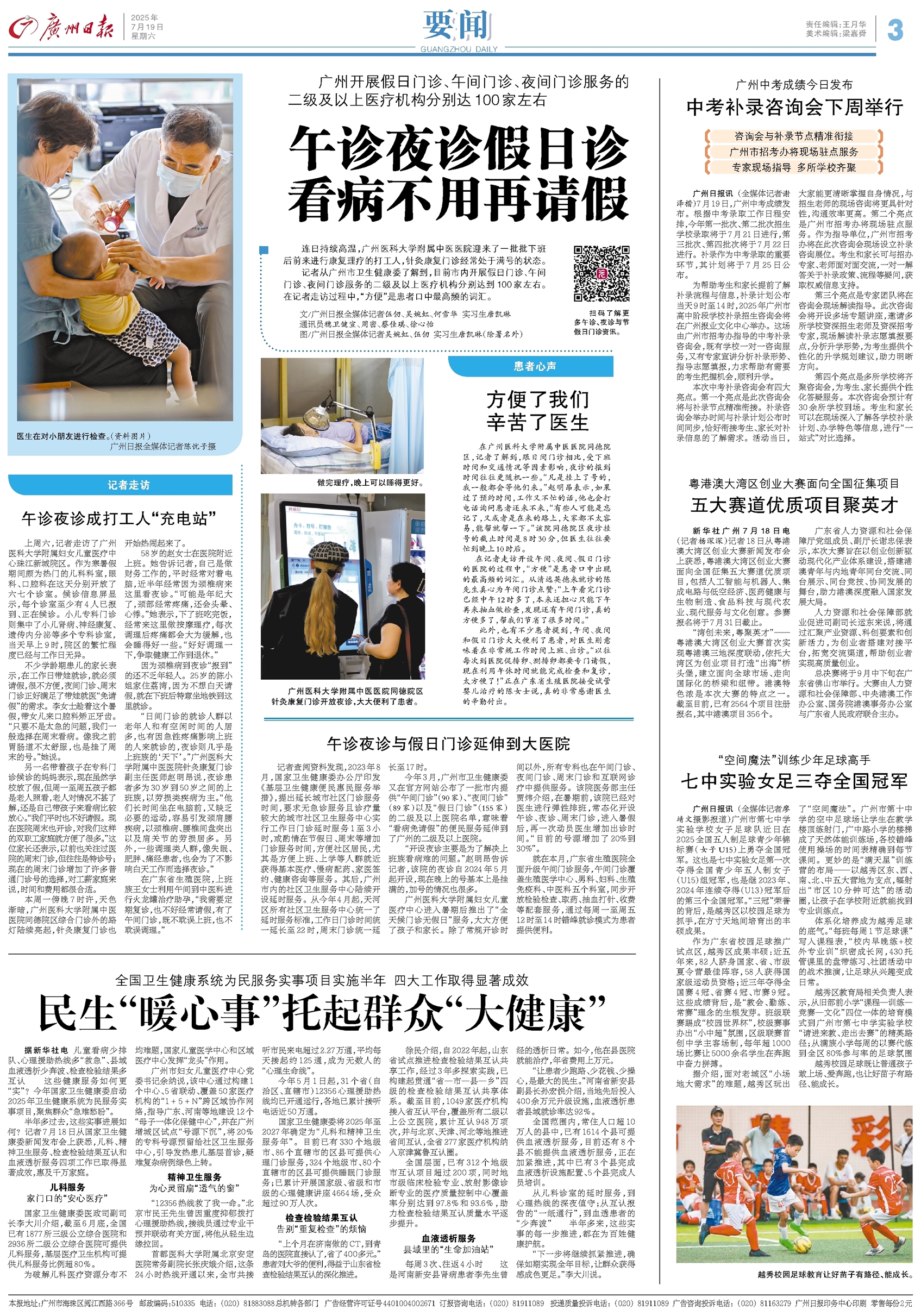- 午诊夜诊假日诊 看病不用再请假 连日持续高温,广州医科大学附属中医医院迎来了一批批下班后前来进行康复理疗的打工人,针灸康复门诊经常处于满号的状态。 记者从广州市卫生健康委了解到,目前市内开展假日门诊、午间门诊、夜间门诊服务的