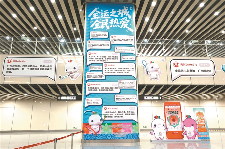 广州日报讯 (全媒体记者李天研 通讯员穗铁宣)8月1日,在距离第十五届全国运动会(以下简称“十五运会”)开幕倒计时100天之际,“全运之城,全民热爱”全民共话全运地铁展示空间正式在地铁广州白云站揭幕亮相,50条从“全运之城,全民热爱——一句话,迎全运”全民征集活动中征集而来的祝福语,配合全运元素点缀地铁空间。同日,由5名参与往届全运会的体育教练员、运动员、裁判员录制的十五运会祝福视频也在全线网地铁车站车厢3.5万个地铁电视上线,向日均近千万乘客展播。