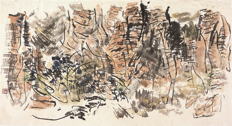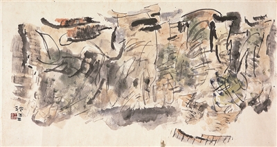 北方突兀的大山,以其特有的造型,形构了王邦彦的内心想象,然后,这内心想象又通过狂草般的大写意,以一种率性的风格而落实为笔墨。这笔墨近乎抽象,但又分明是大山;近乎大山,但的确表现为笔墨。这说明,此时的王邦彦,内心回荡着的,全然是文人的情怀。他像传统文人画家那样,让个人情思徘徊于笔性、水性、墨性与纸性之间,他需要抒发,需要诗意,需要畅达。