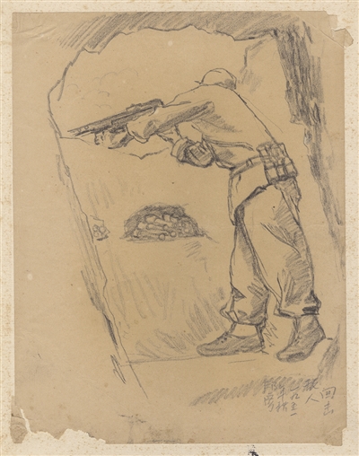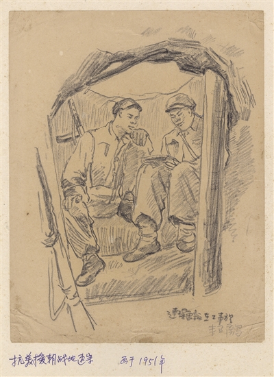 抗美援朝战地速写《在工事里》 纸本炭笔 1951年 王邦彦