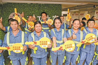 广州日报讯 (全媒体记者汤南 通讯员唐嘉敏、易鹏)“没想到干了十年环卫,能住上这样的房子,月租金还不到100块,我们很满意!”看着自己即将入住的新公寓,环卫工人侯金水高兴地跟记者分享道。日前,广州市白云区城市管理和综合执法局组织开展环卫之家公寓第三批分房活动,通过前期公开抽签方式,15户环卫工人家庭喜领新居钥匙。本批次分房共惠及19名一线环卫工人,其中包括4户双职工家庭。