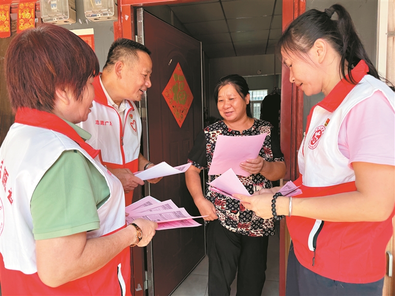 烈日当空,汗水浸透了红白色的志愿者马甲。在海珠区江南中街道的老旧楼道里,赵广军带领志愿者团队一层层爬楼,挨家挨户敲开居民房门。他们用最“笨”的方法——徒步爬楼挨家挨户宣传,却收获了最暖心的回应。面对居民“乘电梯上顶楼再下楼”的贴心建议,赵广军和团队坚持从一楼起步,“这样楼上居民才能提前做好准备”,而街坊们送上的解暑茶水和一句“你辛苦啦”,让这份坚持更有意义。