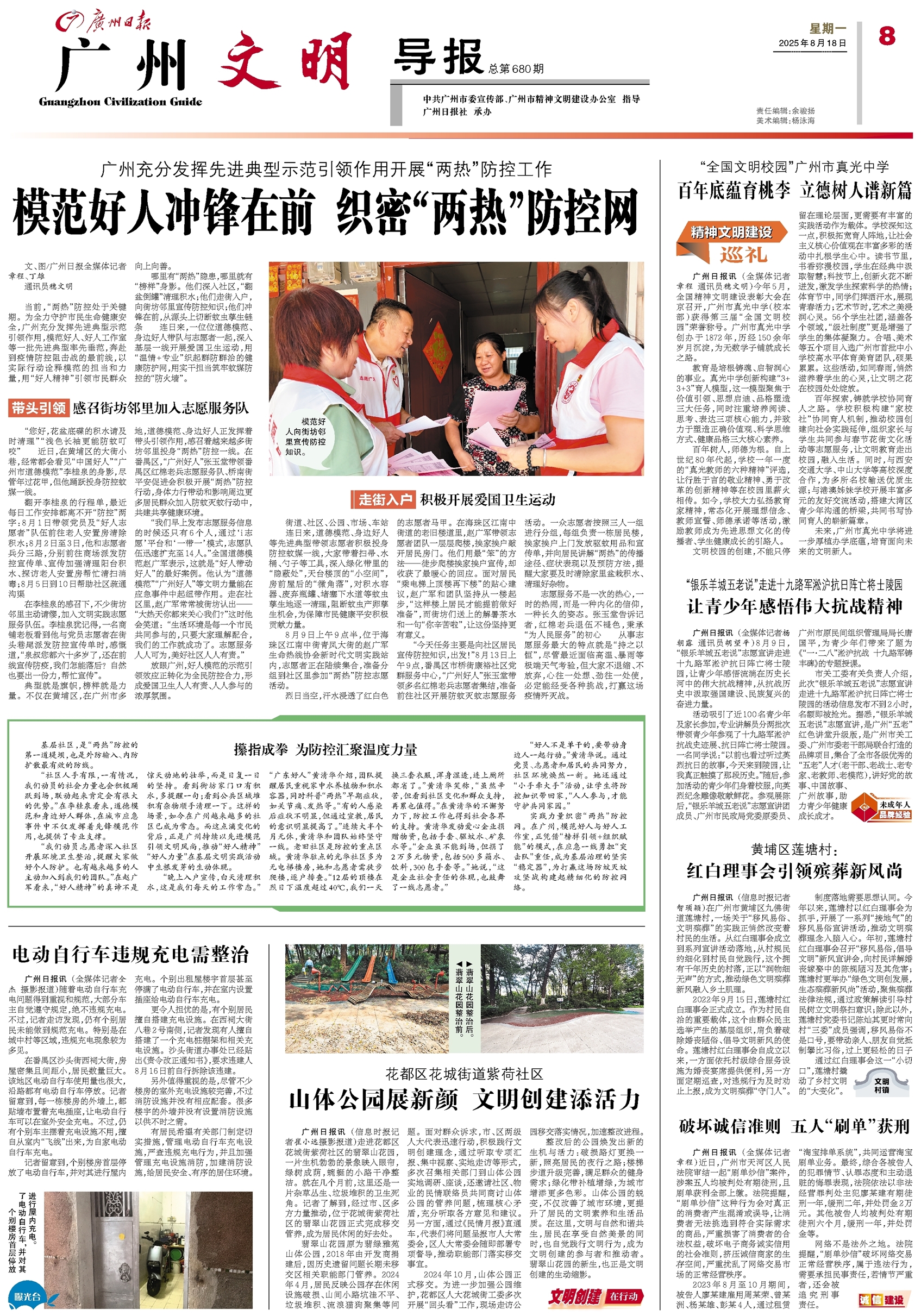 - 模范好人冲锋在前 织密“两热”防控网 文、图/广州日报全媒体记者章程、丁雄 通讯员穗文明 当前,“两热”防控处于关键期。为全力守护市民生命健康安全,广州充分发挥先进典型示范引领作用,模范好人、好人工作室等一批先进典型率先垂范,奔赴