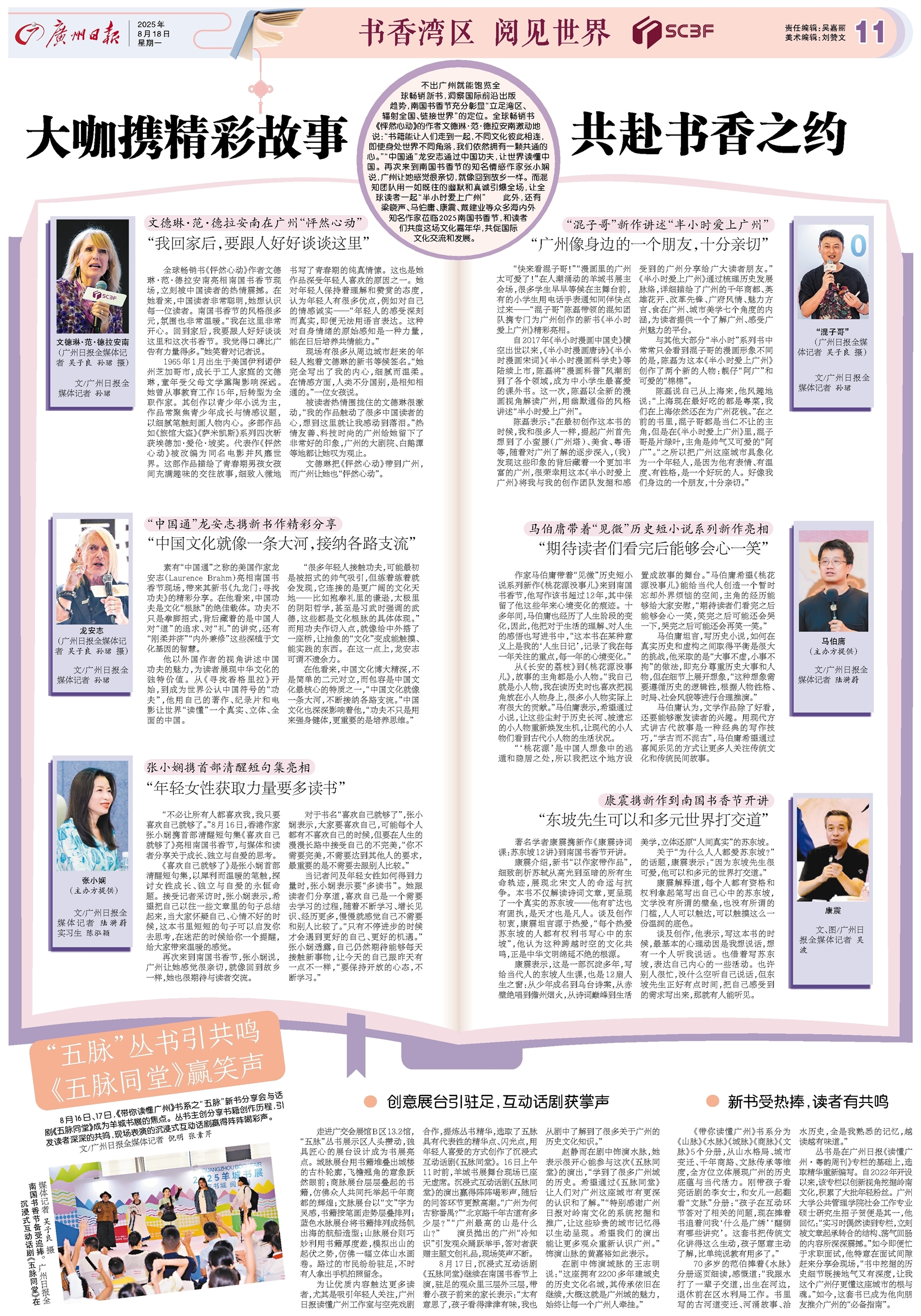 - “五脉”丛书引共鸣 《五脉同堂》赢笑声 8月16日、17日,《带你读懂广州》书系之“五脉”新书分享会与话剧《五脉同堂》成为羊城书展的焦点。丛书主创分享书籍创作历程,引发读者深深的共鸣,现场表演的沉浸式互动话剧赢得阵阵喝彩声。 文/广