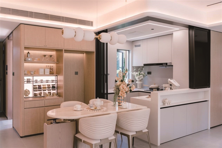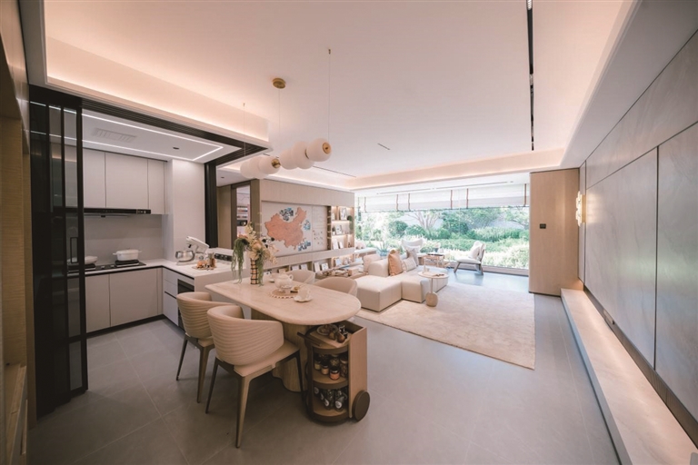 在第一批新规产品营造的大空间尺度感之上,下半年的新规产品结合景观资源,在空间尺度的打造上再进一步。以荔湾白鹅潭板块的诚汇新都·榕府来看,其建筑面积约125平方米的江景创意板房,以独立玄关开启专属归家仪式,LDKB全南向全景大方厅,打破了空间界限。结合无界观景阳台,推窗可见江。整体布局采用“2+2”灵动空间设计,半开放式餐厅和厨房连通,主卧套间有270°环幕观景,充分利用江景资源。横沙旧改项目融资区全新三期新组团,结合西南方3.88万平方米的东苑公园景观,设计成全南向新规纯四房产品。