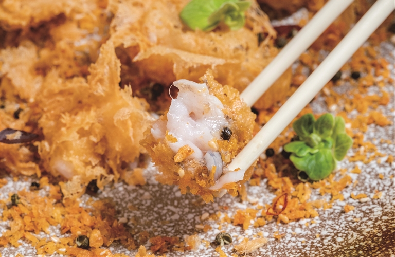 九肚鱼亦不容错过。选品质好的九肚鱼,需形态完整,肉质富有弹性、有光泽。九肚鱼的做法讲究,要使鱼肉完好,还需使其有滋有味,需厨师费一番心思。广东人喜欢令其入汤,滑嫩的肉“吸溜”入口,去除玻璃软骨,一抿即化,鲜嫩丝滑。若将其做成干椒盐风味,外表酥脆,咸香爽口,内里汁水饱满,软滑似若无骨。