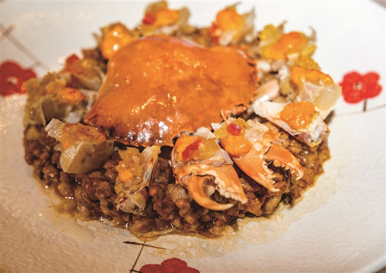 本地消费者还很爱兰花蟹,其又被称为花蟹、蓝花蟹等,因外壳有花纹而得名,体形大,整体呈蓝绿色并布有浅蓝或白色斑驳,母蟹膏肥,公蟹柔嫩。粤菜中有道经典的“姜葱炒兰花蟹”,将公蟹的胃、足、尖刺去除,用葱、小黄姜生炒,加入少许盐、蚝油和白糖,再加水、勾芡,炒制的蟹肉吸满汤汁,肉质滑嫩,油润不腻,鲜味盈满口腔,即便是家常菜,亦有多层风味。