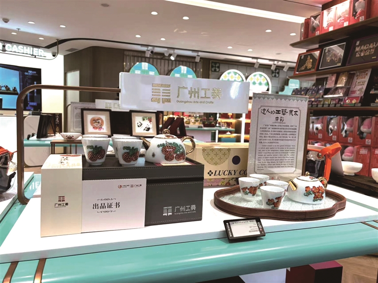 门店中庭还特设了岭南文化与中华老字号品牌体验专区,门店内的有税区域专设国潮主题馆,汇聚广州工美、深山集市等品牌,将广彩、牙雕技艺与现代设计相融合,打造兼具文化与消费属性的“可带走的手信”。