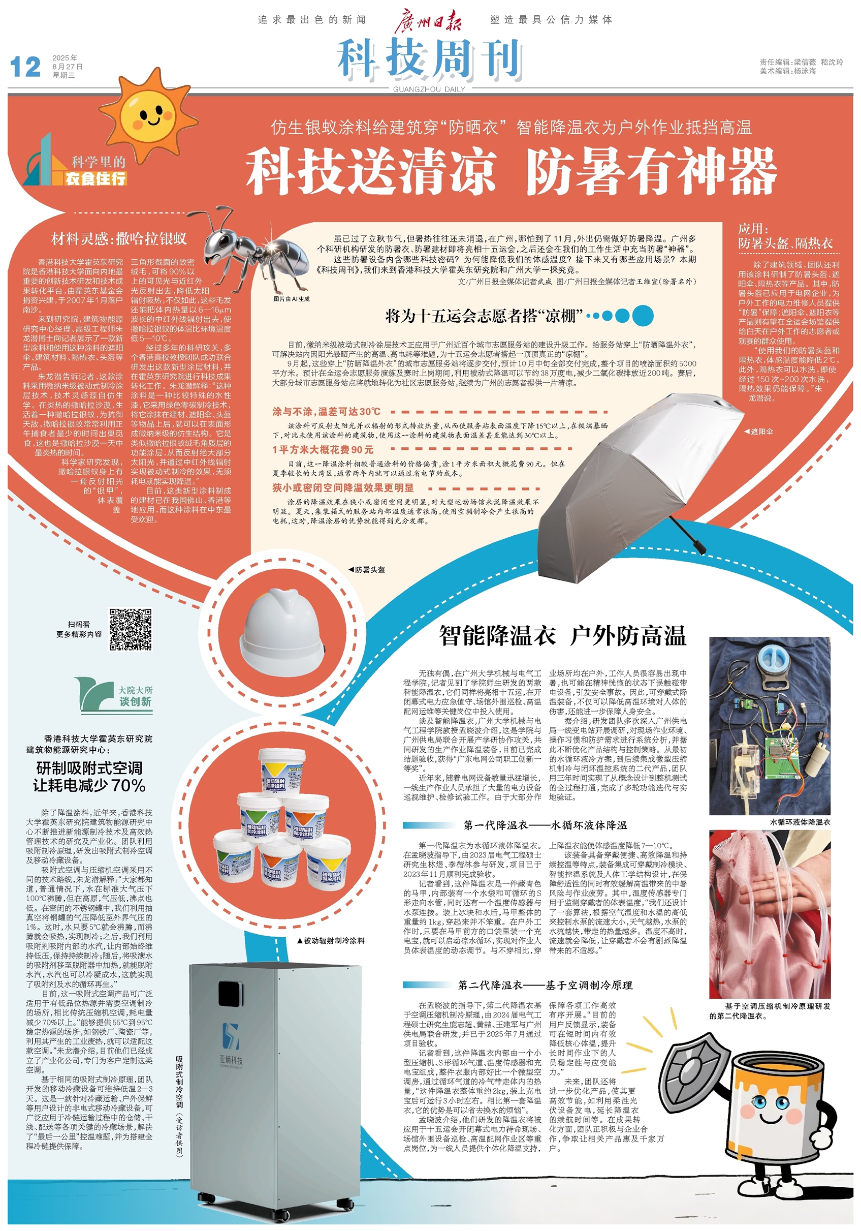 科学里的衣食住行 虽已过了立秋节气,但暑热往往还未消退,在广州,哪怕到了11月,外出仍需做好防暑降温。广州多个科研机构研发的防暑衣、防暑建材即将亮相十五运会,之后还会在我们的工作生活中充当