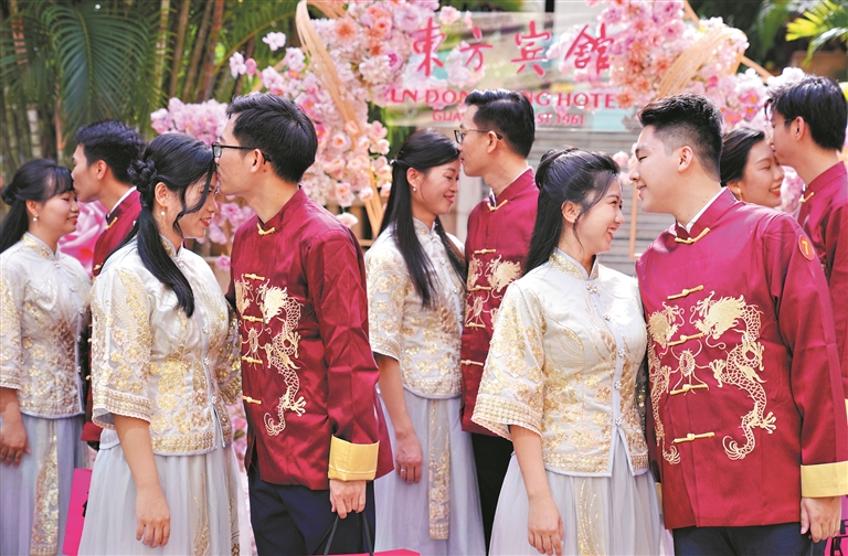 当天,位于广州东方宾馆户外中庭花园的“花城有囍”结婚登记户外颁证点正式启用。10对新人身着盛装携手走过花路,徜徉在岭南园林内,漫步在曲水亭阁间,许爱之名,共度此生。“一拜天地,二拜高堂,夫妻对拜……”在悠扬的仪式声中,新人们在经验丰富的大妗姐引导下,在双方亲友及现场嘉宾的共同见证下,虔诚行三拜之礼。