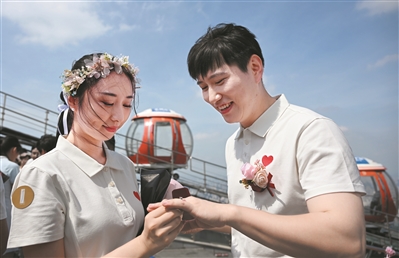 一边运动一边“撒糖”也是本次活动的亮点之一。分布在海心桥、广州塔顶和广州塔广场不同区位的鹊桥会、幸福之旅、慈善登高、爱神之箭、接力表白等趣味轻运动贯穿整个婚礼,同时向市民开放,不少感兴趣的市民前往打卡共享新人浪漫甜蜜。参加婚礼的周先生表示:“这场婚礼太梦幻了,还能参加这么多趣味运动,既能锻炼身体,又增进了我和老婆的默契。”