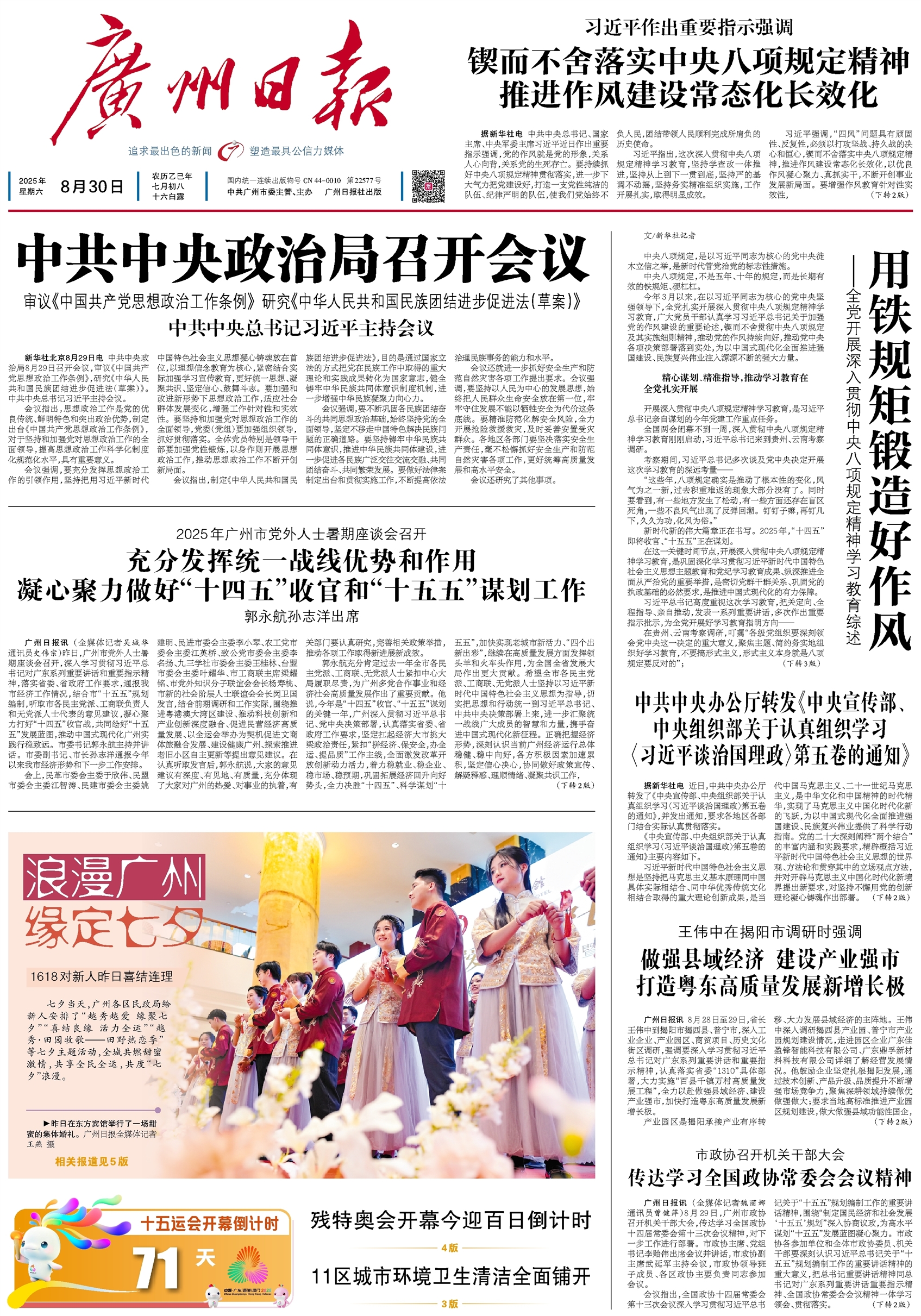 - 充分发挥统一战线优势和作用凝心聚力做好“十四五”收官和“十五五”谋划工作 广州日报讯 (全媒体记者吴城华 通讯员史伟宗)昨日,广州市党外人士暑期座谈会召开,深入学习贯彻习近平总书记对广东系列重要讲话和重要指示精神,落实省委、省政府工作要求,通报我市经济工作情况,结合市“