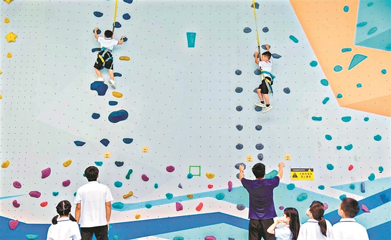 “这个墙好酷,我要爬!”在滨海未来攀岩墙前,一名小男孩在老师的指导下兴奋地抓住色彩明丽的岩点,身手敏捷地向最顶端爬去。