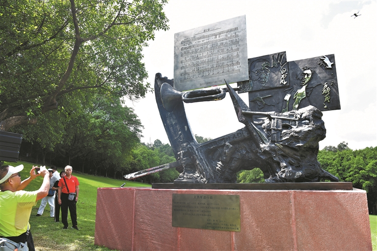 广州日报讯 (全媒体记者叶卡斯 通讯员汪张跃)9月2日上午,纪念中国人民抗日战争暨世界反法西斯战争胜利80周年主题雕塑《义勇军进行曲》落成揭幕仪式,在广州雕塑公园大草坪举行。活动以“铭记历史·共筑和平”为主线,通过国歌奏唱、雕塑落成剪彩、抗战歌曲联唱等环节,缅怀革命先烈,传承红色基因。