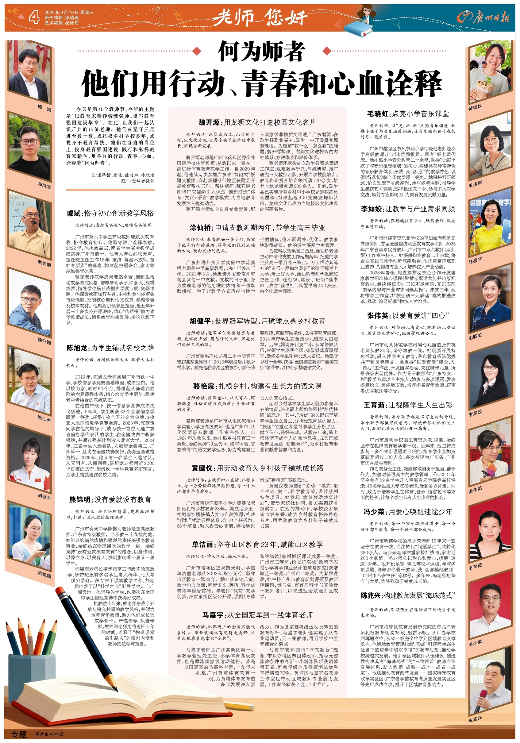 今天是第41个教师节,今年的主题是“以教育家精神铸魂强师,谱写教育强国建设华章”。在此,让我们一起认识广州的16位老师。他们或坚守三尺讲台数十载,或扎根乡村学校多年,或投身于教育帮扶。他们在各自