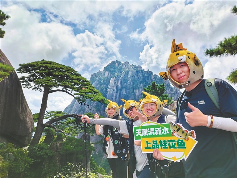 在西海大峡谷形似鳜鱼的“鱼石”前,大家喊出“清新桂花鱼勇闯黄山”的口号,为两地双城互动加油鼓劲。登顶过程中,“桂花鱼”与游客互动并向游客赠送文创小礼品,游客点赞“你们是黄山最靓的鱼”。