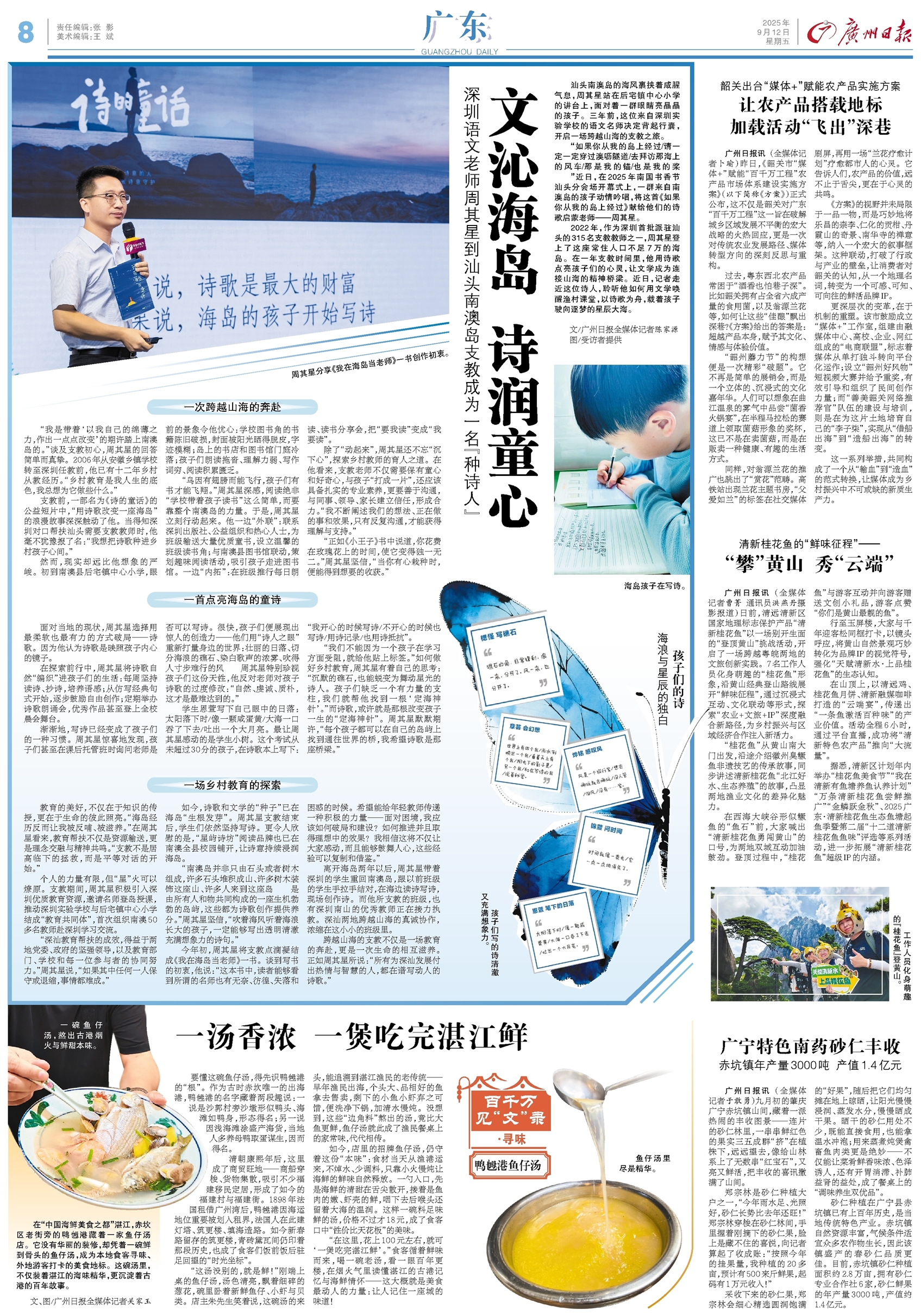 - 文沁海岛 诗润童心 汕头南澳岛的海风裹挟着咸腥气息,周其星站在后宅镇中心小学的讲台上,面对着一群眼睛亮晶晶的孩子。三年前,这位来自深圳实验学校的语文名师决定背起行囊,开启一场跨越山海的支教之旅。 “如果你从我