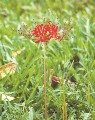 石蒜别称“曼珠沙华”和“彼岸花”,因富含神秘色彩而广为人知。石蒜拥有“花叶不相逢”的特质。每到春夏交替之际,石蒜的叶片便会慢慢枯萎,进入一个短暂的休眠期。随着夏季带来了足够的高温以及充沛的雨水,石蒜的种球便会在某一日突然苏醒,并如同雨后春笋般迅速地举起一支支的花序,绽放美丽的花朵。直至花果期的落幕,石蒜的叶片便会在秋季重新萌发,民间视其为“永不相见”的象征。