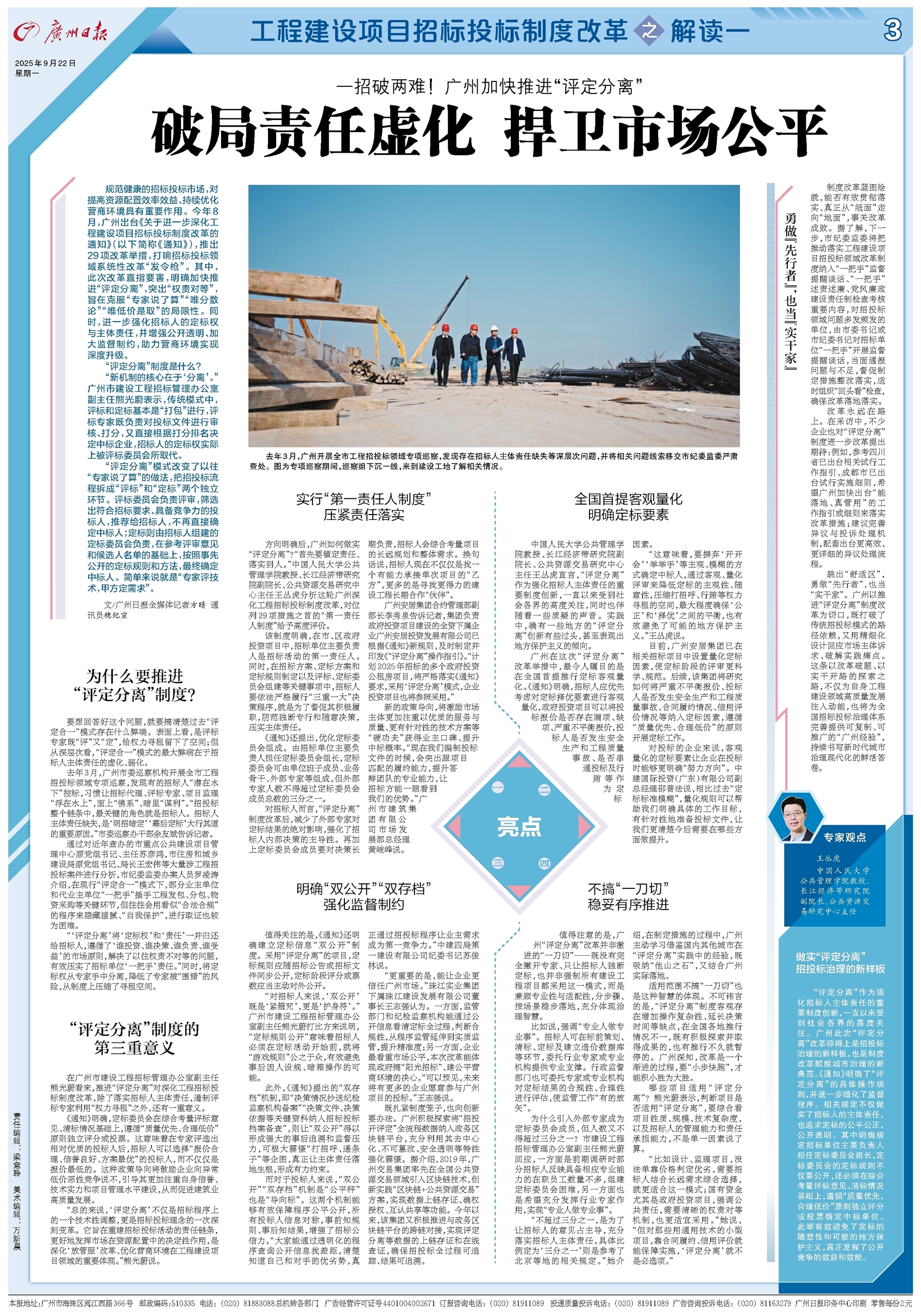 跳出“舒适区”,勇做“先行者”,也当“实干家”。广州以推进“评定分离”制度改革为切口,既打破了传统招投标模式的路径依赖,又用精细化设计回应市场主体诉求、破解实践痛点。这条以改革破题、以实干开路的探索之路,不仅为自身工程建设领域高质量发展注入动能,也将为全国招标投标治理体系完善提供可复制、可推广的“广州经验”,持续书写新时代城市治理现代化的鲜活答卷。