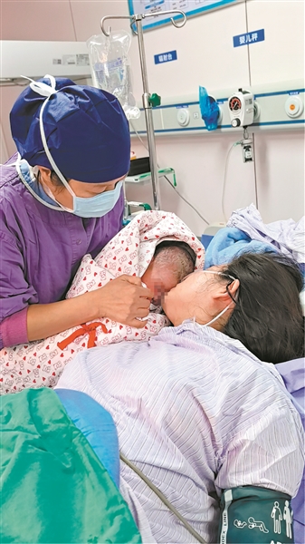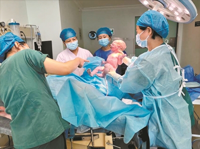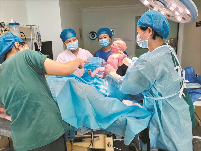 当天一早,产科主任隋珍便带领团队高效完成5台剖宫产手术。当时,9楼产房内还有7名产妇同时待产,其中包括两名外籍人士,护士长卢秀莲带领助产士团队全程监护。此时,32岁的外籍产妇安娜冒着风雨前来待产,从小在内陆国家长大的她第一次遭遇巨大台风,十分焦虑,助产士通过呼吸指导和持续鼓励,帮助她稳定情绪,最终顺利分娩了一名女宝宝。初为人母的安娜十分激动,精通中文的她表示,将考虑给宝宝取个中文名——“桦桦”。