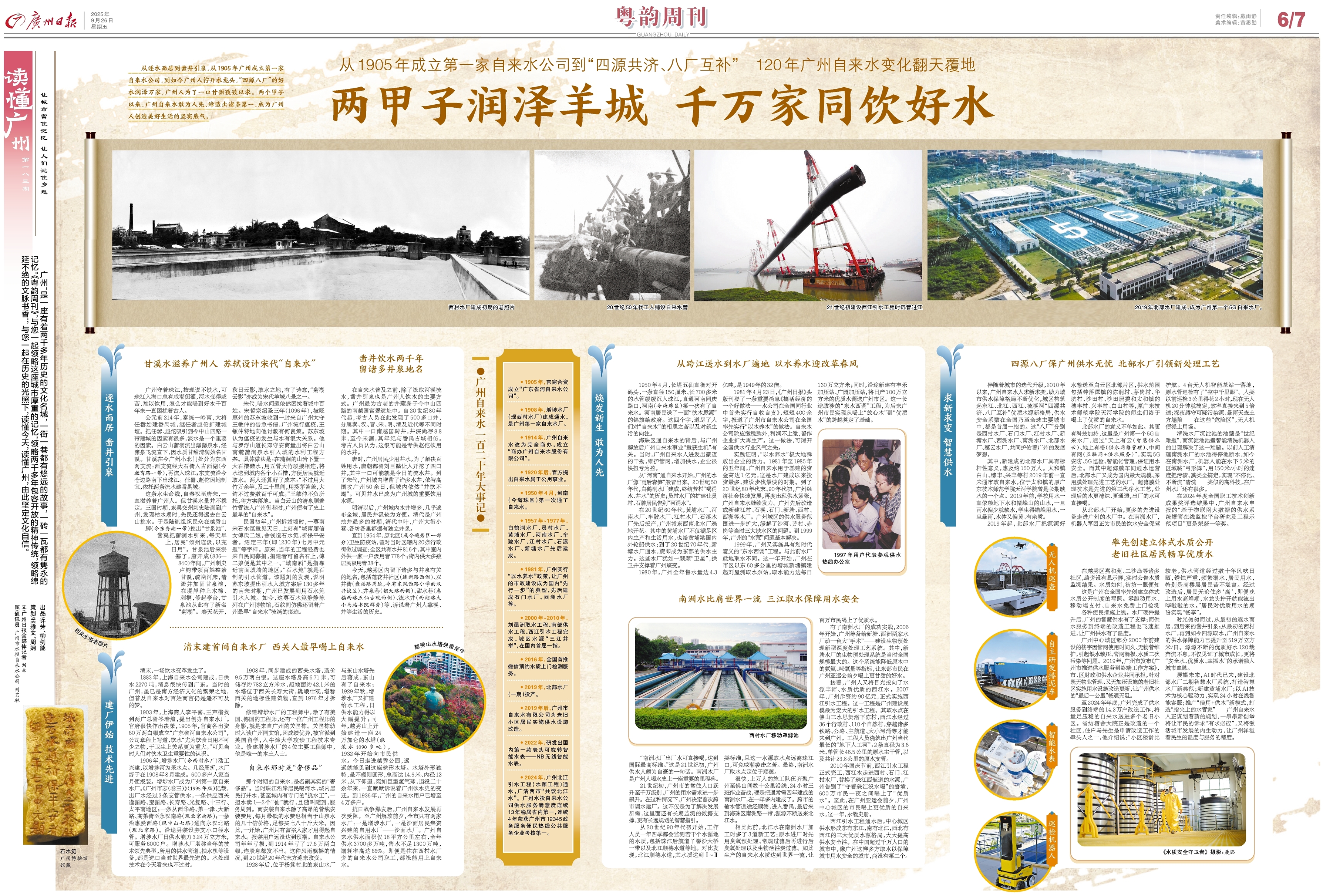 时光匆匆而过,从最初的逐水而居,到后来的凿井引泉;从最初的西村水厂,再到如今四源取水,广州自来水的供水保障能力已提升至519万立方米/日。源源不断的优质好水120载奔流不息,不仅见证了城市成长,更将“安全水、优质水、幸福水”的承诺融入城市血脉。 展望未来,AI时代已来,建设北部水厂二期智慧水厂系统,打造智慧水厂新典范;新建黄埔水厂;以AI技术为核心驱动力,实现24小时在线智能客服;推广“信用+供水”新模式,打造“指尖上的水管家”……广州自来水人正谋划着新的规划,一串串新创举将让市民的诉求“有求必应”,又将激活城市发展的内生动力,让广州洋溢着民生的温度与服务的精度。