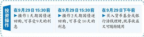 9月29日是国债逆回购的最佳交易时间,投资者可在9月29日15:30前,操作1天期的国债逆回购,可以享受9天的利息;操作2天期的国债逆回购,可以享受10天的利息。