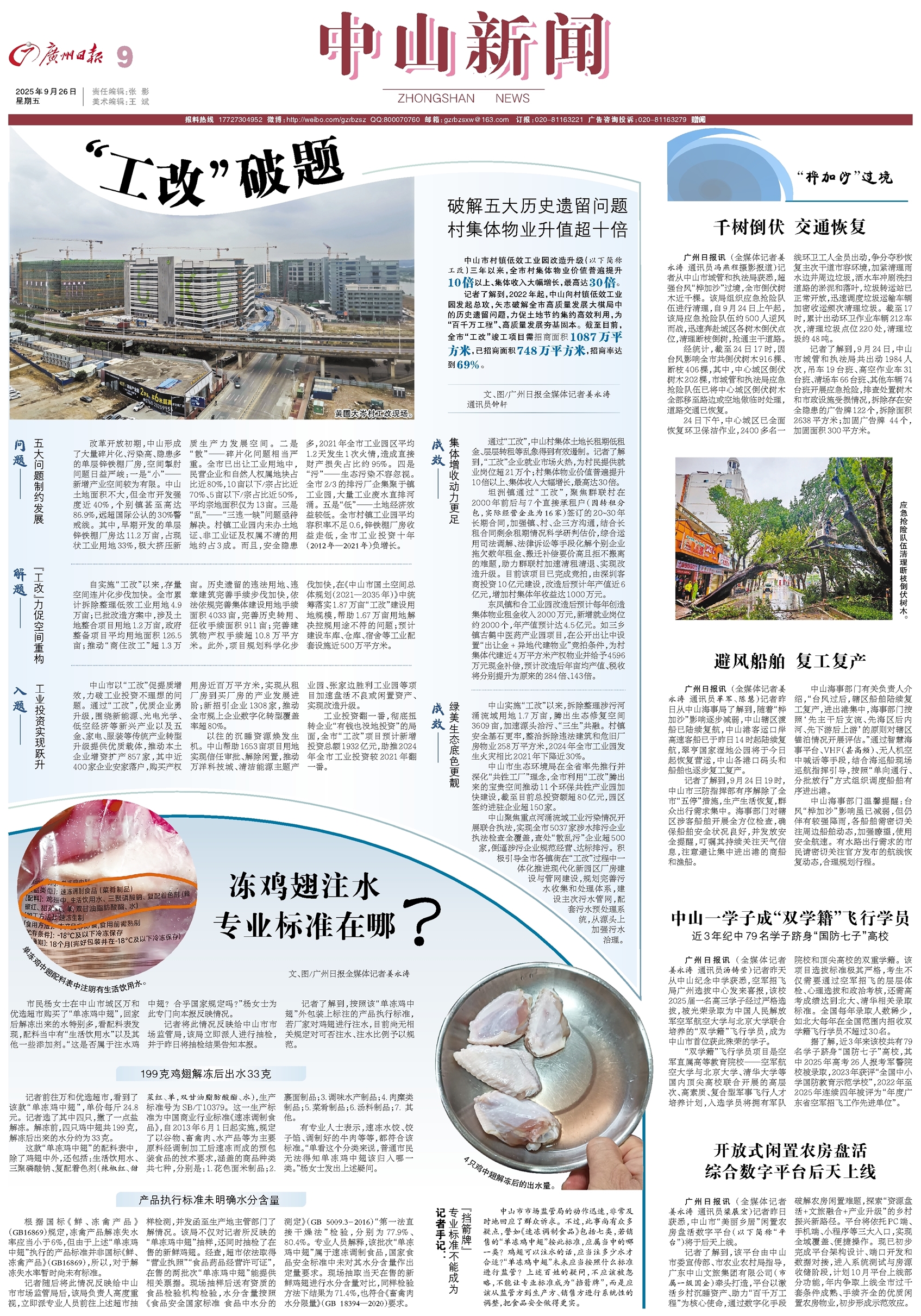 - “工改”破题 中山市村镇低效工业园改造升级(以下简称工改)三年以来,全市村集体物业价值普遍提升10倍以上、集体收入大幅增长,最高达30倍。 记者了解到,2022年起,中山向村镇低效工业园发起总攻,矢志破解全