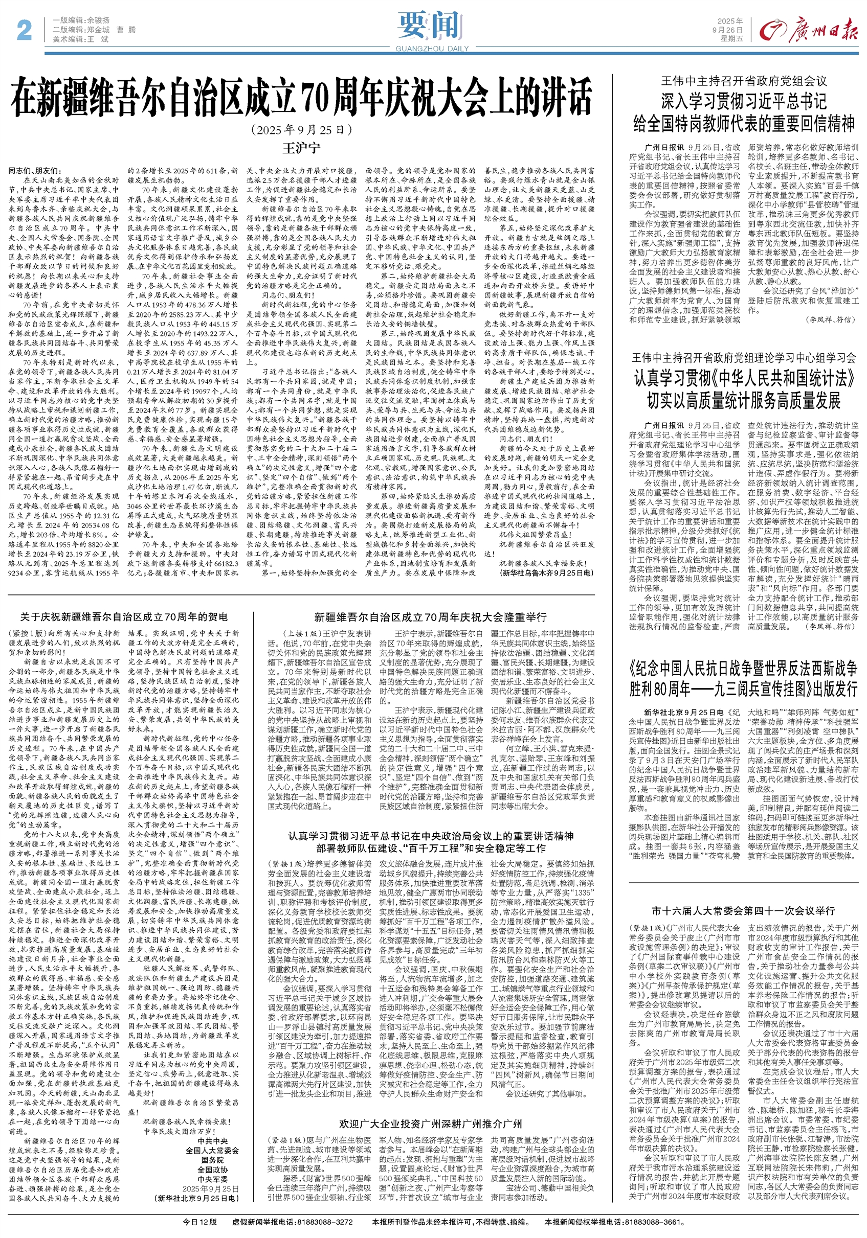 - 新疆维吾尔自治区成立70周年庆祝大会隆重举行 (上接1版)王沪宁发表讲话。他说,70年前,在党中央亲切关怀和党的民族政策光辉照耀下,新疆维吾尔自治区宣告成立。70年来特别是新时代以来,在党的领导下,新疆各族人民共同当家作主,不断夺取社会主义革