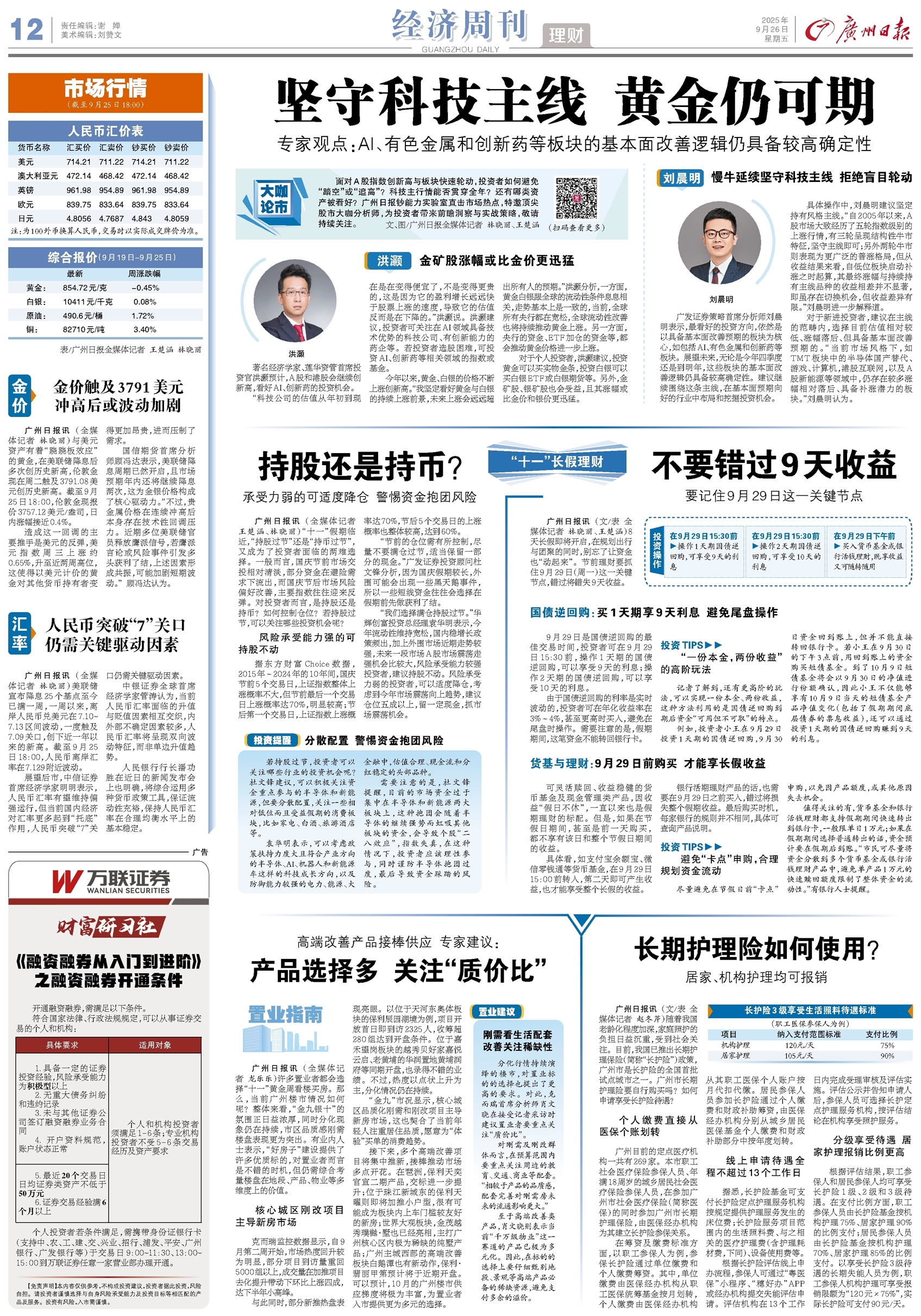 - 坚守科技主线 黄金仍可期 大咖论市 面对A股指数创新高与板块快速轮动,投资者如何避免“踏空”或“追高”?科技主行情能否贯穿全年?还有哪类资产被看好?广州日报钞能力实验室直击市场热点,特邀顶尖股市大咖分析师,为投资者带来