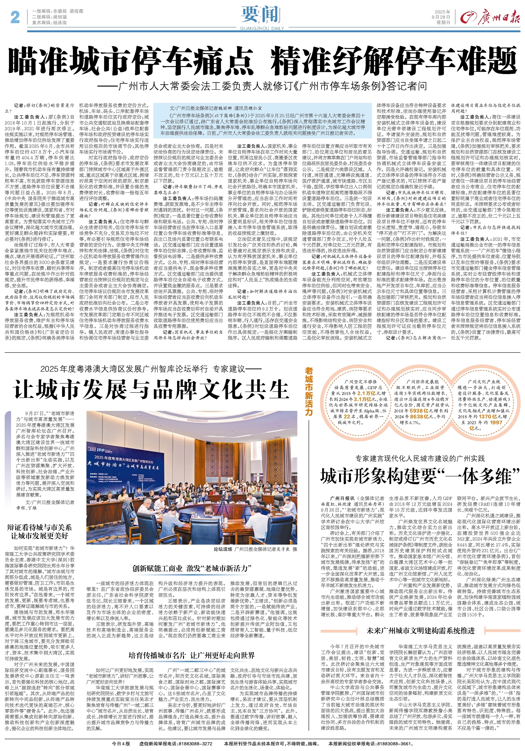 - 让城市发展与品牌文化共生 9月27日,“‘老城市新活力’与城市高质量发展”——2025年度粤港澳大湾区发展广州智库论坛在广州召开。多名与会专家学者聚焦粤港澳大湾区建设世界一流城市群和国际科技创新中心,广州深入推进“老城市新
