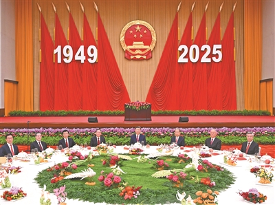 人民大会堂宴会厅华灯璀璨,洋溢着喜庆热烈的节日氛围。主席台上方高悬着庄严的国徽,“1949-2025”大字年号在鲜艳红旗映衬下格外醒目。